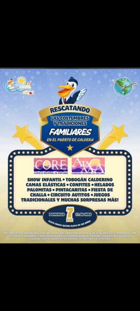 La Corporación de Turismo Sustentable Bahía de Caldera, con el apoyo del Gobierno Regional de Atacama (CORE Atacama), realizará una jornada familiar en Playa Brava dedicada a rescatar y celebrar las tradiciones del Puerto de Caldera. El evento reunirá a niñas, niños y sus familias en un espacio recreativo con juegos tradicionales, actividades infantiles, show en vivo, tobogán calderino, pintacaritas y distintas sorpresas pensadas para fortalecer la identidad local y promover la vida comunitaria. Esta iniciativa cuenta con la colaboración de instituciones clave como la Armada de Chile, Carabineros, el Cuerpo de Bomberos y la Cruz Roja de Caldera, reafirmando el compromiso conjunto por impulsar el turismo, la cultura y el bienestar de la comunidad calderina.